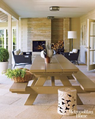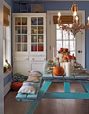 Inside or out, I love picnic tables! I don't really know why. Maybe because I grew up eating on one during the warm summer months. Last year we bought our first picnic table. It's just your traditional, wooden, table for 6. After painting the back patio door last week, I've been thinking the picnic table could use a coat of paint as well. I mean, how can you not love these...
